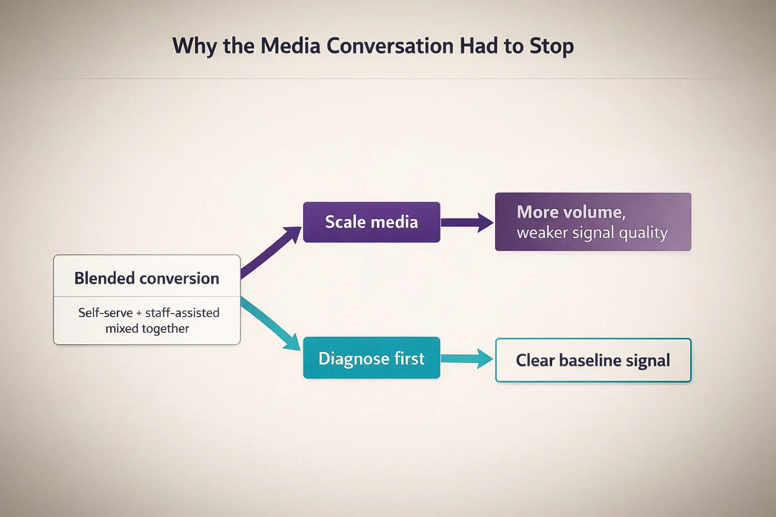 Once we understood how much assisted ordering was being folded into the same system, a media-first conversation stopped making sense. Buying more traffic into that setup would not have clarified performance. It would have made the misunderstanding more expensive.